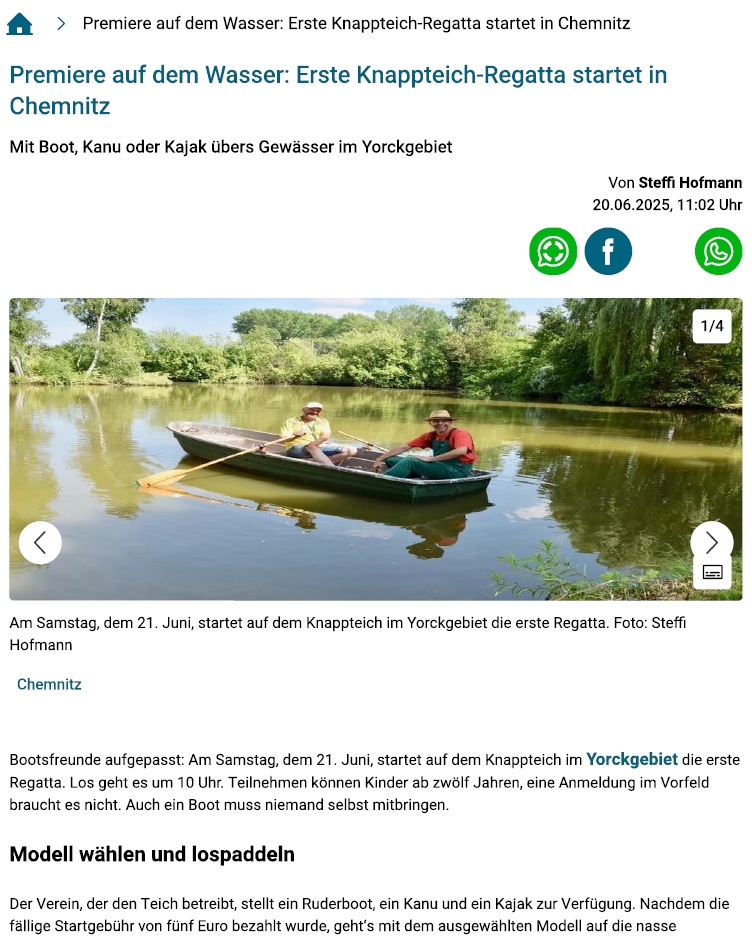Danke an den BLICK (Verlag Anzeigenblätter GmbH Chemnitz) für die Veröffentlichung des Artikels: Premiere auf dem Wasser: Erste Knappteich-Regatta startet in Chemnitz