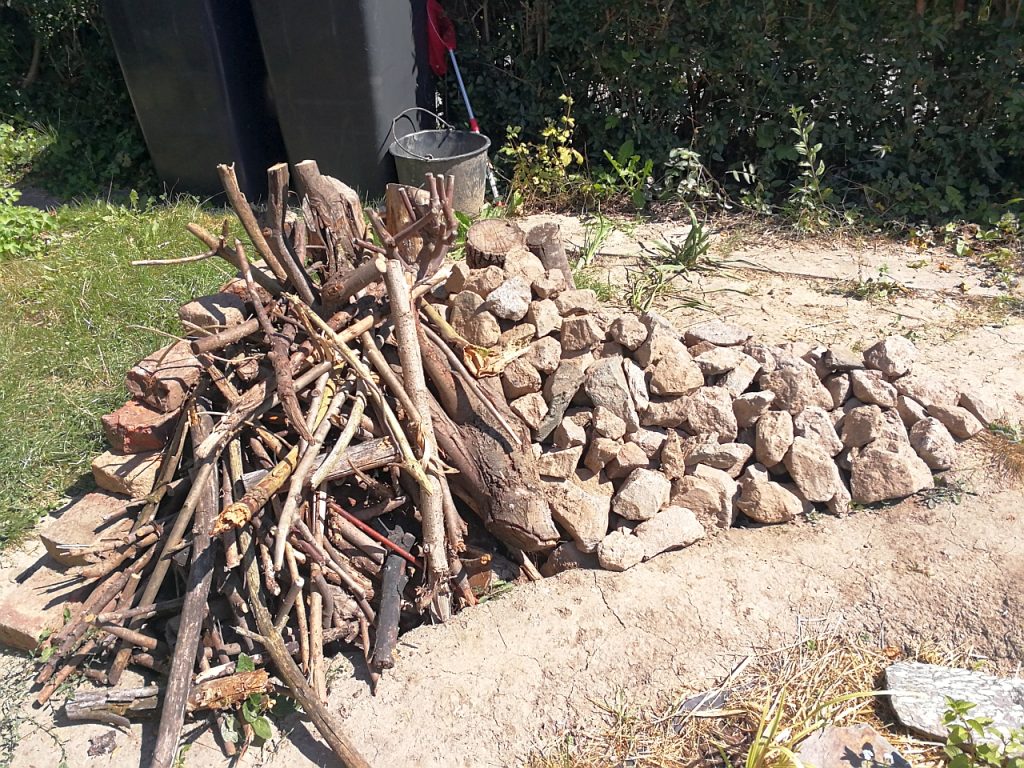 Zu Beginn haben wir ein Loch von ca. 50cm Tiefe ausgeschachtet (es muss so tief sein, damit es darin einigermaßen frostfrei bleibt). Dann kam eine etwa 10cm dicke Schicht grober Schotter/Steinchen hinein – falls im Loch nach heftigen Niederschlägen mal Wasser stehen sollte, verhindert diese Schicht das Ertrinken der Tiere. Die eine Hälfte des Lochs haben wir anschließend mit etwa handgroßen Steinen gefüllt und diese zu einem Haufen aufgeschichtet (=Eidechsenburg). Für die andere Hälfte nutzten wir alte Äste verschiedenster Baumarten, um das Loch zu füllen und ebenfalls einen Haufen aufzubauen (=Käferkeller). Gleich daneben füllten wir noch eine kleine Mulde mit Sand (=Mini-Sandarium), welche von Eidechsen und Schlangen ggf. zur Eiablage genutzt werden kann. Ungewaschenen Sand benötigen darüber hinaus bestimmte Wildbienen zum Anlegen ihrer Brutröhren.
