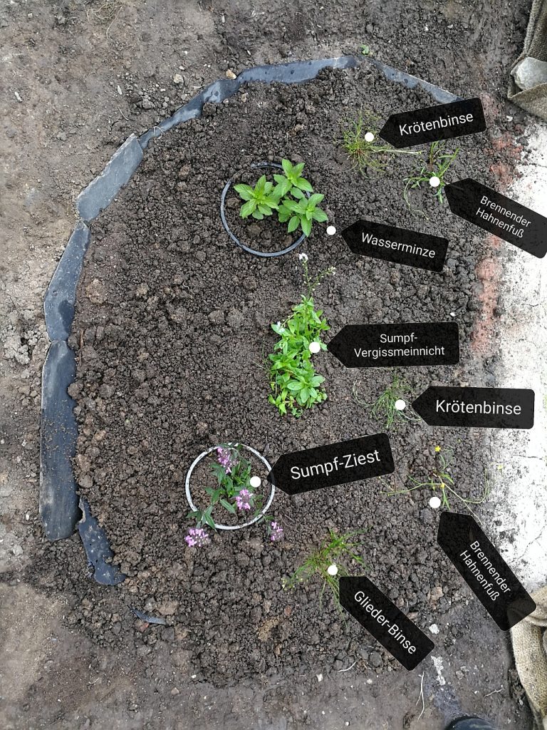 Im Sommer kamen wir unverhofft zu Sumpfpflanzen, sodass die Bepflanzung des Sumpfbeetes in einer spontanen Aktion erledigt werden konnte. Sieben verschiedene Pflanzen sind inzwischen in das nasse Beet eingezogen. Die stärker wüchsigen Pflanzen wie Wasserminze und Sumpfziest haben wir mit Topf gepflanzt, damit auf diese Weise das Wachstum etwas begrenzt wird. Dem Sumpfvergissmeinnicht gefällt es allerdings offenbar auch so gut an diesem Standort, dass es sich fröhlicher ausbreitet als gedacht – es könnte wohl auch noch einen Topf gebrauchen oder einen alternativen Platz…;-)
