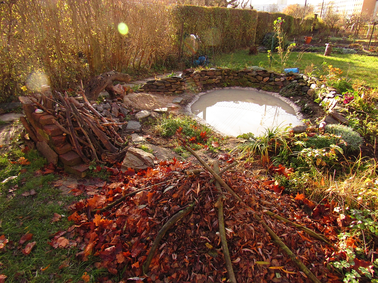 Im Spätsommer erlebten wir eine gewissermaßen unangenehme Überraschung: Unser Lichtteich enthielt plötzlich kaum noch Wasser. Nein, es lag nicht daran, dass es ein Tier ausgetrunken hätte (es waren keine Spuren zu sehen), und es war auch nicht verdunstet (denn zwei Tage nach dem Auffüllen war der Teich wieder komplett leer). Mmh…also wohl irgendeine Undichtigkeit…wo und wodurch auch immer – ehrlich gesagt ist uns das bis heute ein Rätsel geblieben. Aber in den letzten Wochen haben wir nochmal einen Reparatur-Einsatz gemacht, den Teich mit etwa 700 Litern (Regen-)Wasser komplett gefüllt und hoffen nun, dass er den Winter unbeschadet übersteht.